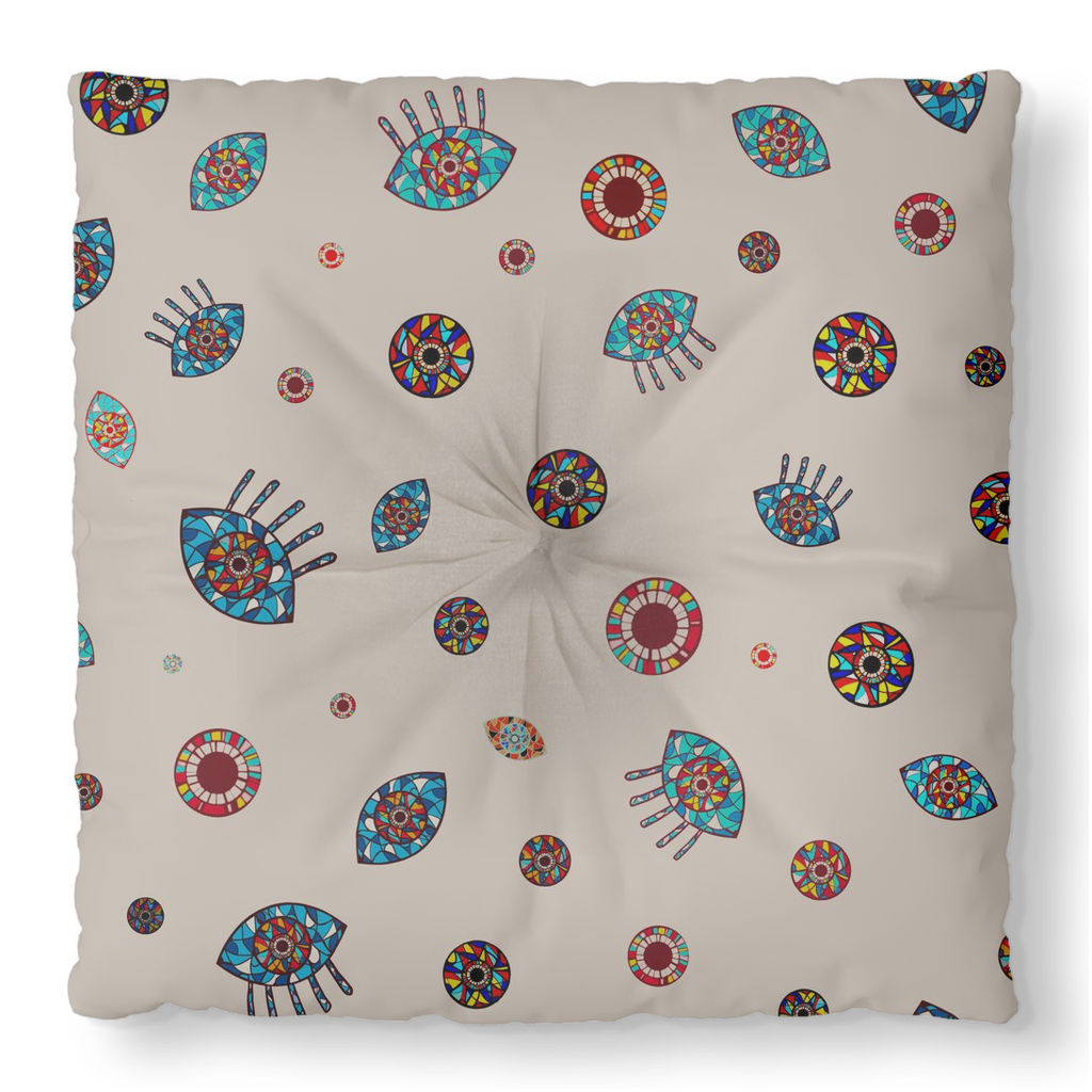 The mystical Evil Eye is a traditional symbol in Greece, known for warding off negative influences and bringing good fortune. Add a touch of positive energy and style to your space with our double-sided square tufted floor pillow, featuring our unique Evil Eye design that comes in two different colors and sizes.